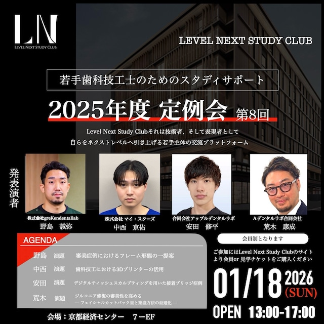 < Level Next Study Club定例会 > の参加費お支払いページです。 ※ 非会員のオブザーバー参加は6,000円/1回分となります ▼ 定例会の内容 ▼ Level Next study club、それは技術者、そして表現者として、今よりもさらに前進したステージへと向かうことを目的としています。 歯を作る技術力やそれを魅せる感性。 また、それらを正しく伝えるための知識や経験を積む場所として当会は在ります。 年3回開催される定例会を通じて、日本・韓国・台湾で開催される国際大会での登壇を目指し、当会は若手歯科技工士をしっかりと後押ししていきます。 --------詳細内容-------- ▶︎第8回定例会 日程:2026年1月18日(日)13時-17時 開催場所 : 京都 烏丸 < 京都経済センター 7-EF > 〒600-8009 京都府京都市下京区函谷鉾町78番地 --------- ご案内とお願い --------- ▶︎ご購入手続きをいただきましたら、必ず下記URLよりオブザーバー用LINEグループへの参加もあわせてお願いいたします。 (発送連絡メール内にも記載しております) ▶︎定例会に関する事前のご案内や懇親会の参加確認につきましては、すべて該当のLINEグループにてお知らせしております。 ▶︎【オブザーバー用LINEグループ】 URL:https://line.me/ti/g/PYS086t2jo ※LINEの入っているスマホ、タブレットよりアクセスください --------- 備考 --------- ・こちらご購入後にシステムの都合上【発送連絡】が送信されますが、当会からの【発送物】はございませせん。 ご購入確定のお知らせ の報告連絡として留意ください。 ・領収書につきましてはご購入時にお送りする「ご購入いただきありがとうございました」のメールと、 決済方法ごとの受領書をあわせて、領収書の代わりとしてご利用ください。 なお、インボイス登録番号の記載はございません。ご了承ください。 -------------------------------------------------------- IFAA - Level Next Study Clubでは、 3年に一度、インターナショナル コングレス < 日本・韓国・台湾 で行う国際大会 > も開催しております。 詳細は、弊社 ホームページをご覧ください。 https://studyclubifaa.wixsite.com/ifaa